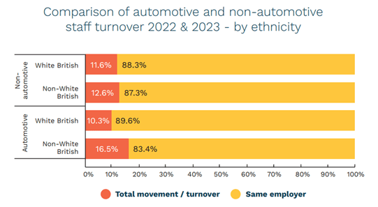 Moreover, the attrition rate among non-White British individuals, though notably higher than their White British counterparts, has seen a decrease from 18.7% in 2022 to 12.5% in 2023. This shift prompts questions about the impact of diversity on retention and a sense of belonging within the automotive workforce.